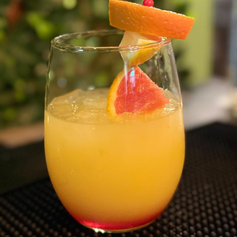 Premium wine-based Tequila and orange juice. Served over ice in stemless wine glass and garnished with Grenadine and orange wheel.