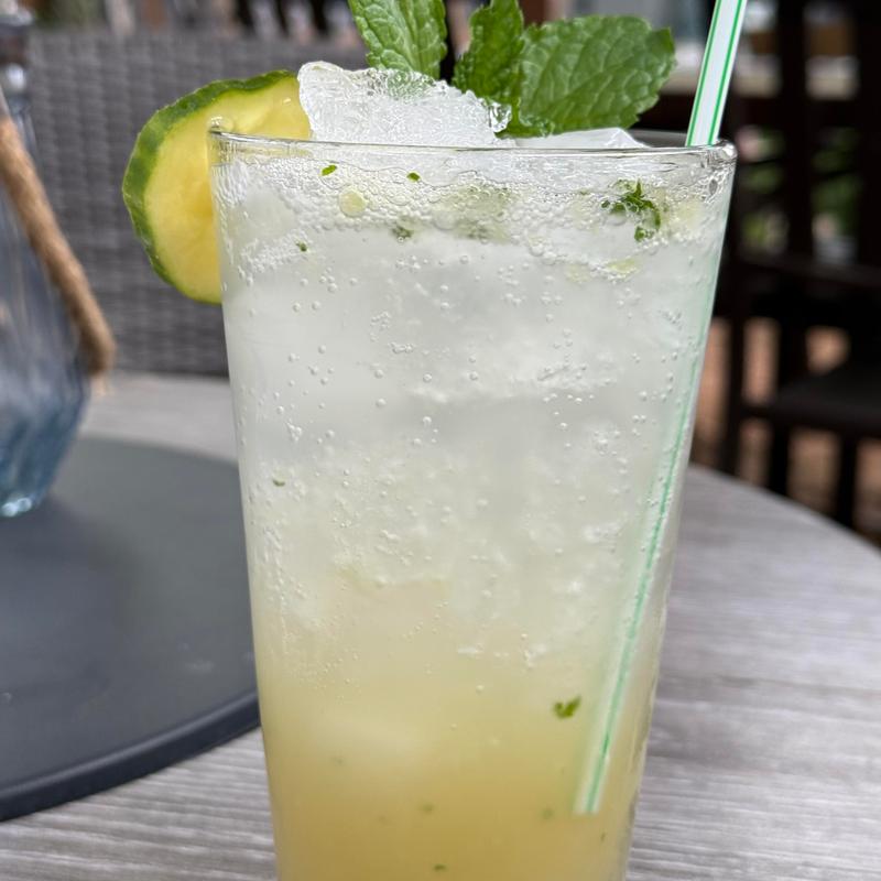 Muddled cucumber, mint, lime juice, and sparkling water. Perfect summer drink!