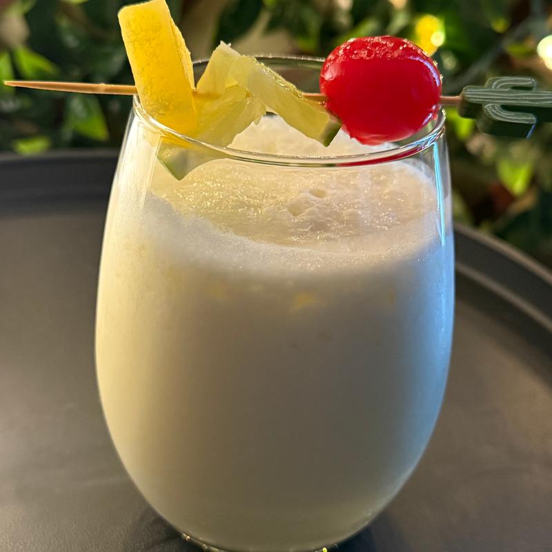 Coconut milk, and pineapple juice, blended with ice. Garnished with pineapple, cherry, and coconut shavings.