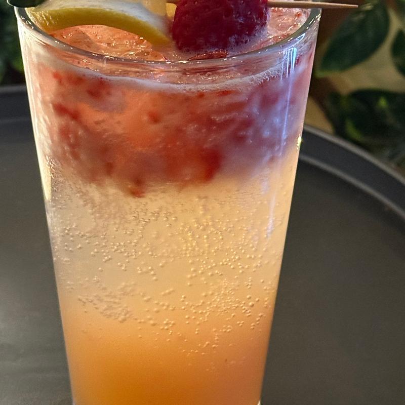 Muddled strawberries, lemon juice, and sparkling water. Refreshingly fruity!