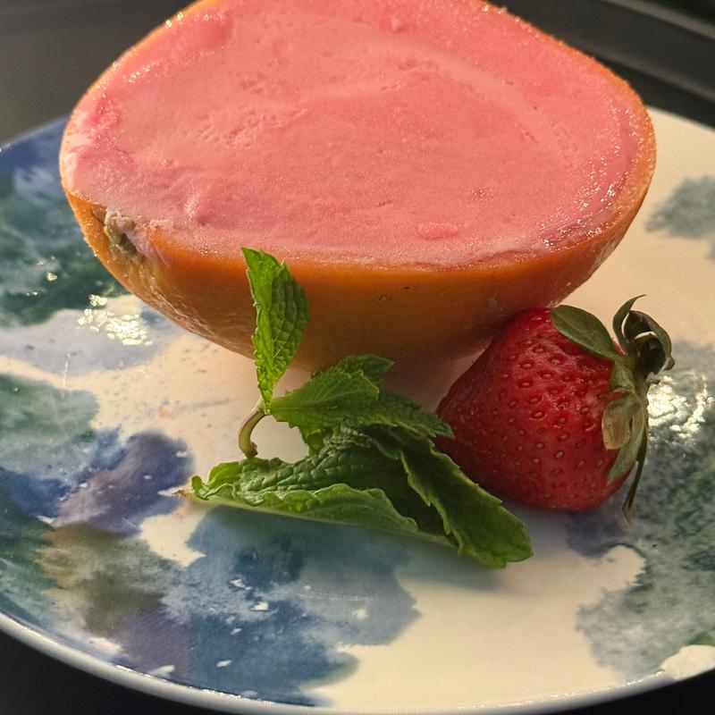 Silky berry sorbet with a touch of cream and grapefruit - frozen in a large grapefruit shell! Non GMO, gluten free and Kosher. The perfect after-dinner treat!