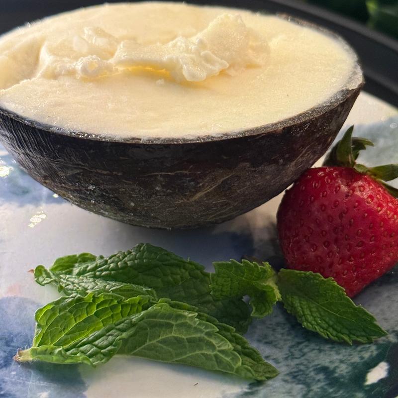 Silky coconut sorbet with a touch of cream frozen in a real coconut shell! Non GMO, gluten free and Kosher. The perfect after-dinner treat!