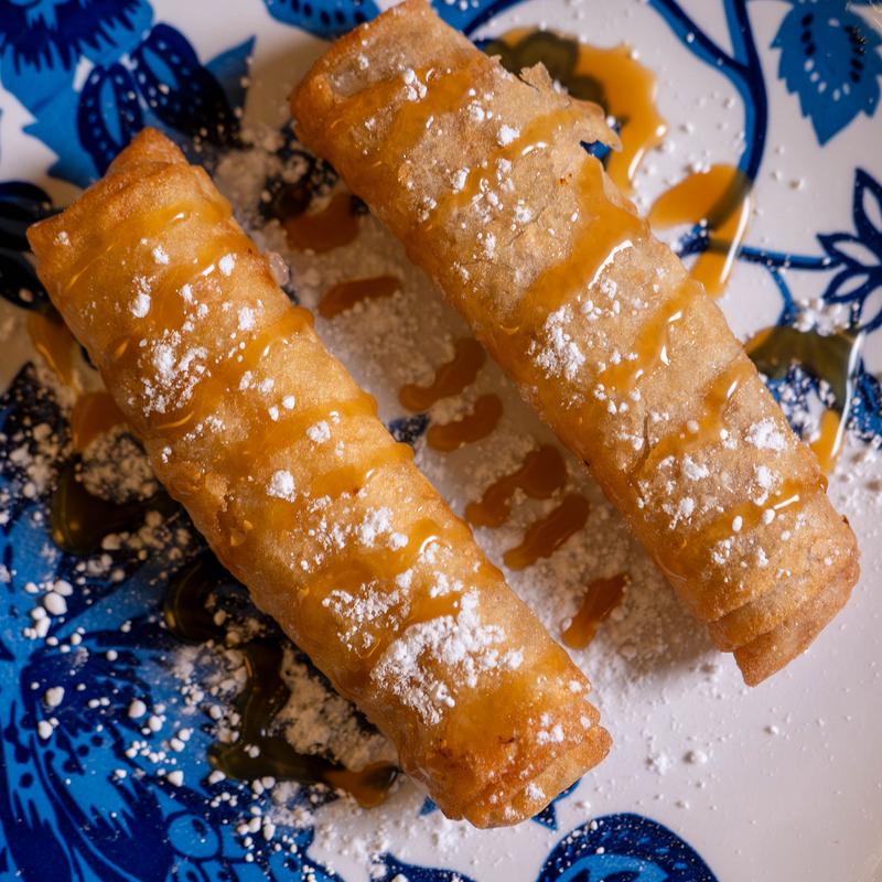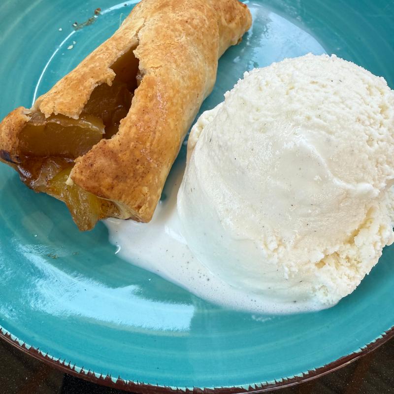 Fried apples with cinnamon and sugar, wrapped in a pie shell, and warmed to perfection. Served with a scoop of rich vanilla bean ice cream! It's pretty rich - enough to satisfy even the most demanding sweet tooth!